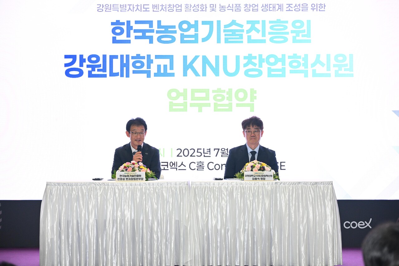 한국농업기술진흥원(원장 안호근, 이하 농진원)은 지난 7월 16일 서울 코엑스에서 열린 '농식품 테크 스타트업 창업 박람회'에서 강원대학교 KNU창업혁신원(원장 최용석)과 농식품 분야 벤처창업 활성화 및 지원 강화를 위한 전략적 업무협약을 체결했다.