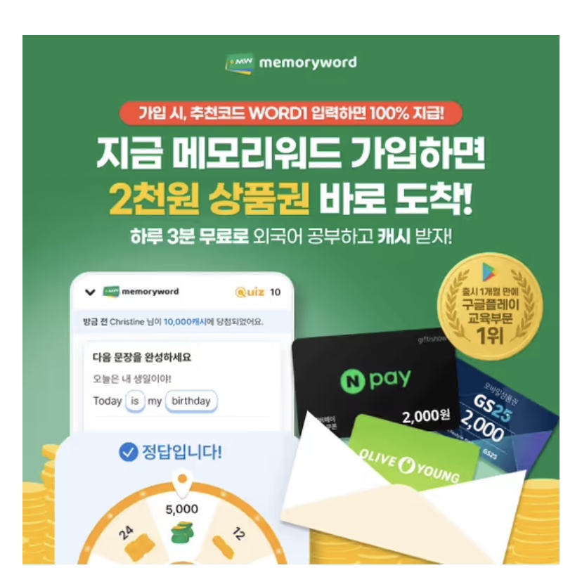 돈 버는 영어회화 앱 메모리워드, 가입하면 상품권 지급
