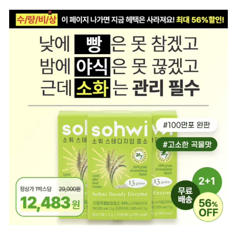 야식 먹고 바로 눕고 싶다는 생각 누구나 하잖아요?!이제 [소휘 소화 효소]로 한포로 속도 마음도 편하게 누워요🔑이 링크를 나가면 이 혜택은 없어요