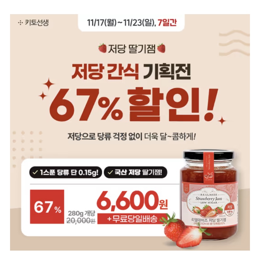 🎊 [저당특가 67% 할인] 국산 저당 딸기잼 개당 6,600원 + 무료당일배송