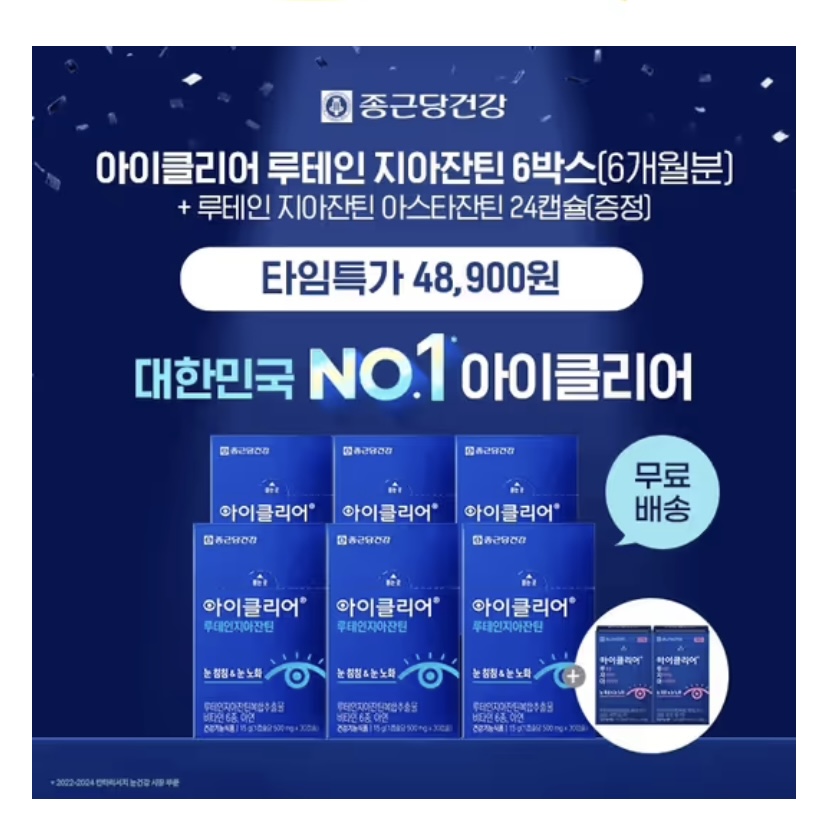 대한민국 No1, 종근당건강의 눈 건강 토탈 케어 제품 '아이클리어 루테인 지아잔틴 6박스'를 '루테인 지아잔틴 아스타잔틴 24캡슐' 증정과 함께 초특가 00,000원에 무료배송 진행됩니다.