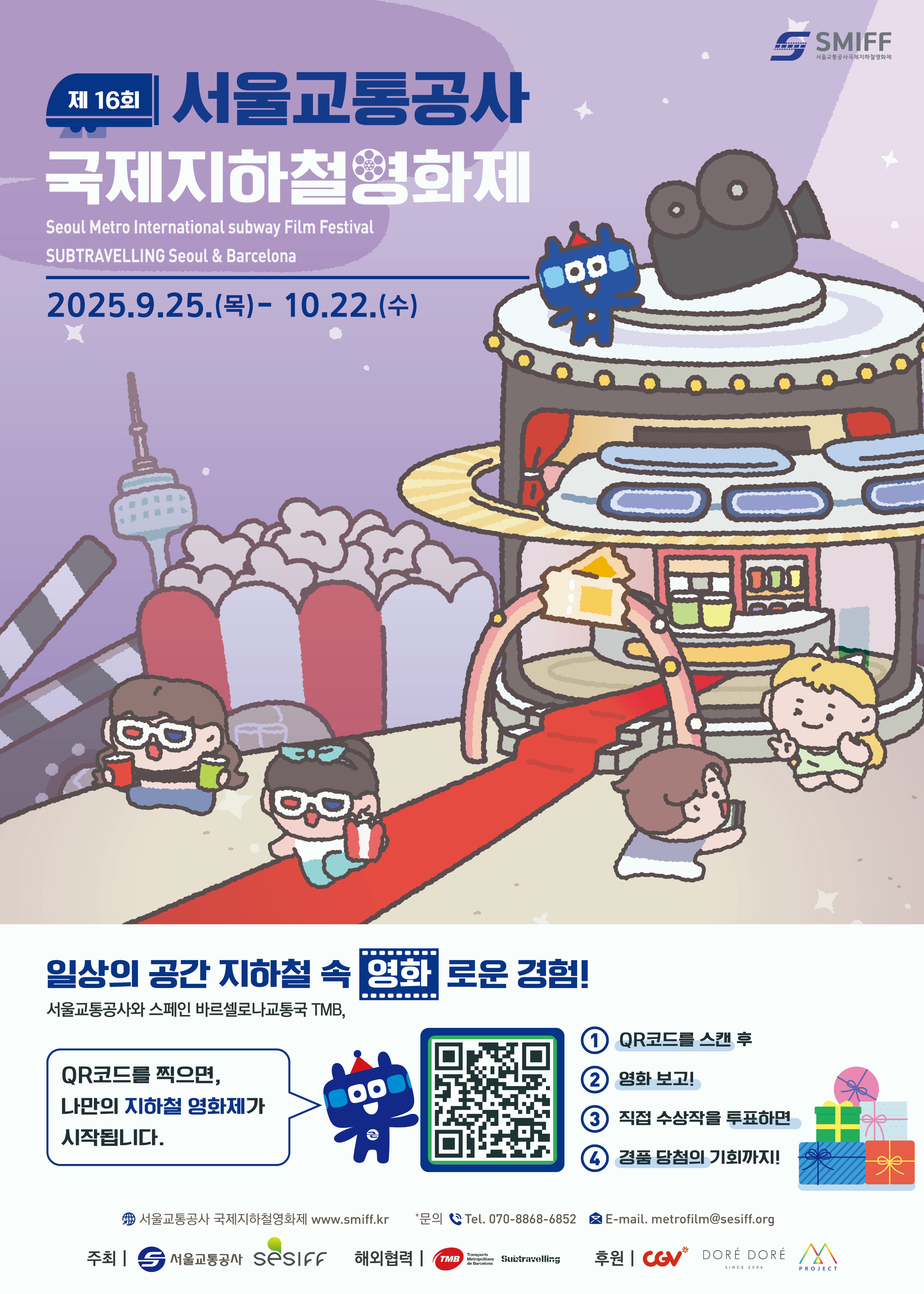 ■ 서울교통공사(이하 ‘공사’라고 함)는「제16회 서울교통공사 국제지하철영화제(이하 ‘국제지하철영화제’라고 함)」가 9월 25일부터 10월 24일까지 약 한 달간 열린다고 밝혔다.