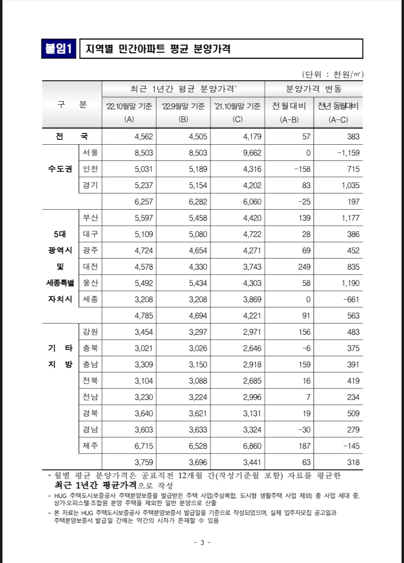 □ 주택도시보증공사(사장 권형택, 이하 ‘HUG’)는 2022년 10월말 기준 ‘민간 아파트 분양가격 동향’을 발표하였다.