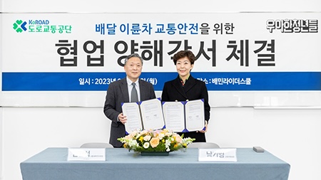 도로교통공단(이사장 이주민)은 우아한청년들(대표이사 김병우)과 13일 배민라이더스쿨에서 「배달 이륜차 교통안전 강화를 위한 양해각서(MOU)」를 체결하고 배달 이륜차 교통안전 및 배달 종사자의 교통법규 준수 의식 강화를 위한 협업을 추진하기로 했다.