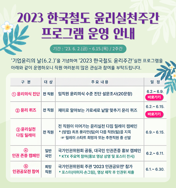 주요 행사로는 △윤리의식 자가진단 △윤리실천 다짐 릴레이 △윤리 퀴즈 △인권가치 대국민 캠페인 △인권존중 공모전 참여 등의 5대 프로그램이 진행된다.